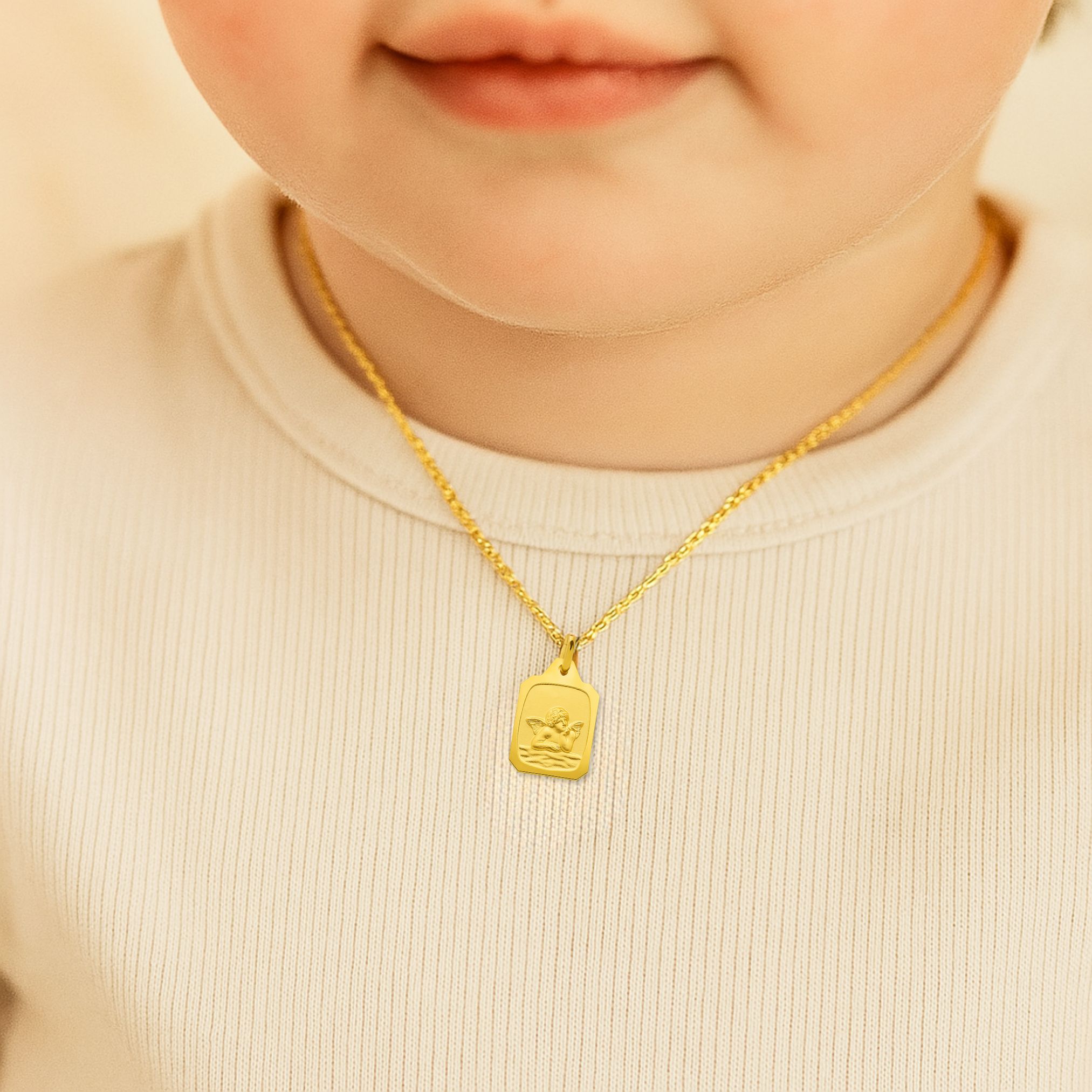 Mit seiner rechteckigen Form und der Größe von ca. 8 x 10 mm wirkt der Anhänger dezent und dennoch sehr ausdrucksstark. Der warme Glanz des Gelbgolds macht ihn zu einem zeitlosen Schmuckstück, das besonders als Geschenk zur Geburt, Taufe oder Kommunion von Herzen kommt.
