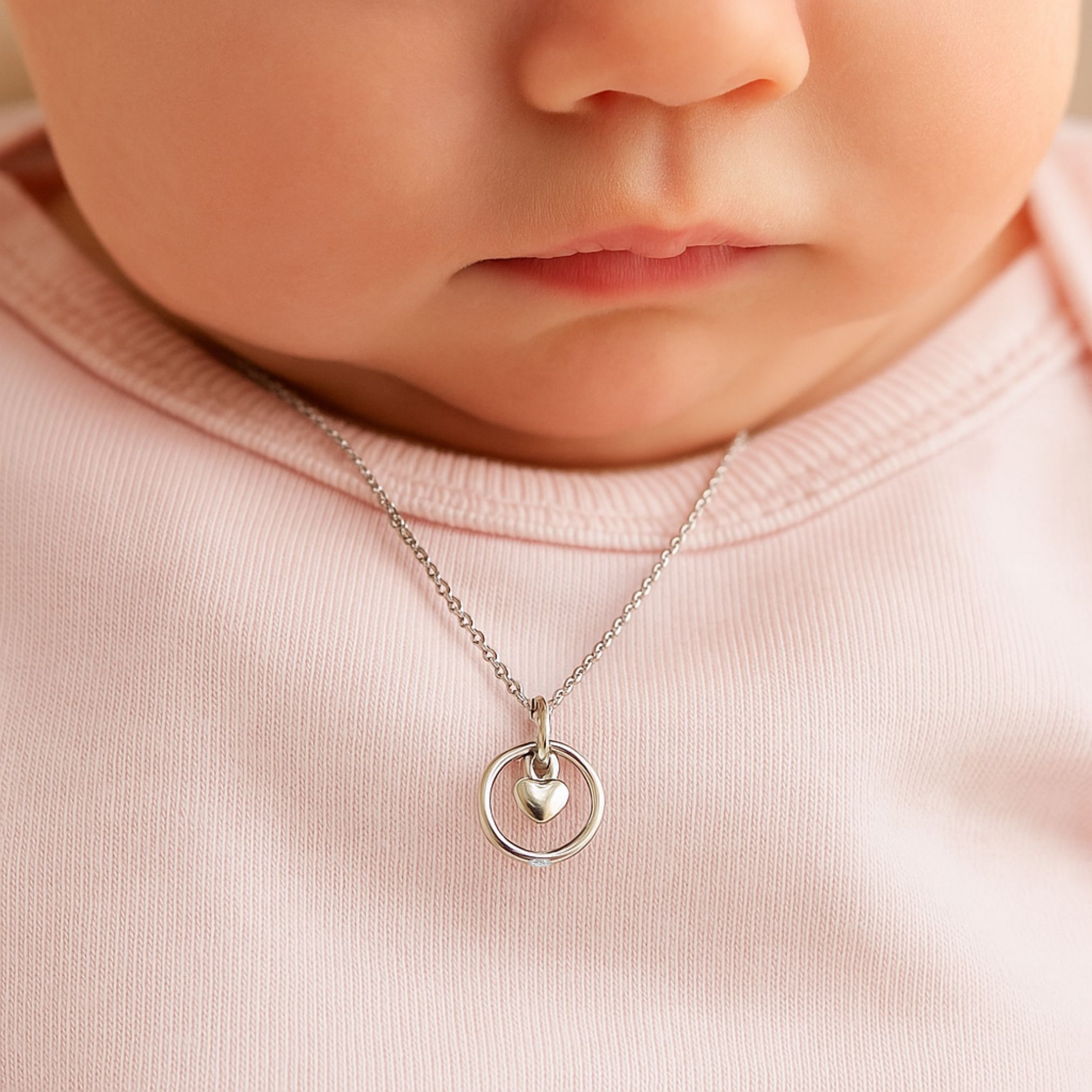 Das glänzende Herz in der Mitte symbolisiert die Liebe, die das Kind sein Leben lang begleitet – der funkelnde Zirkonia erinnert an die Einzigartigkeit und das Strahlen jedes kleinen Wunders.