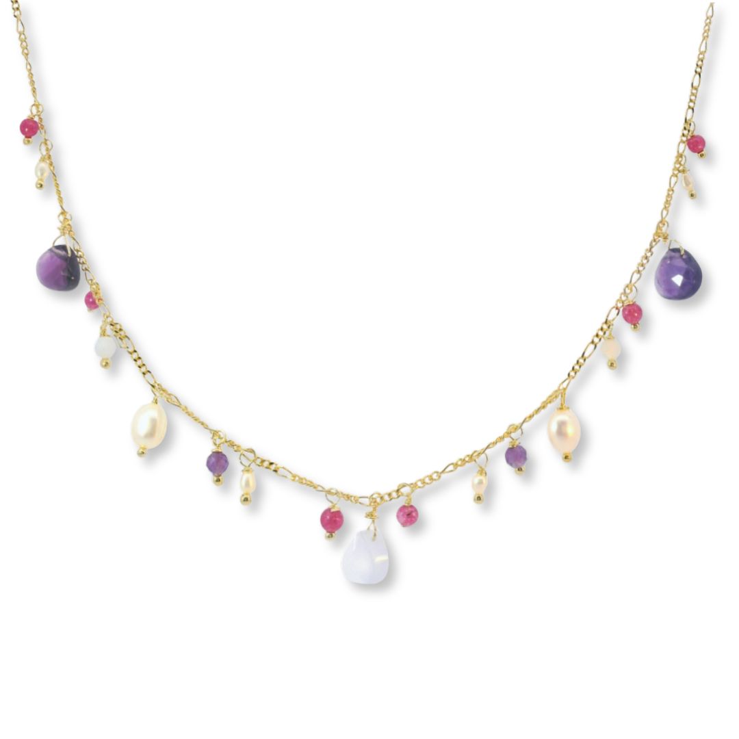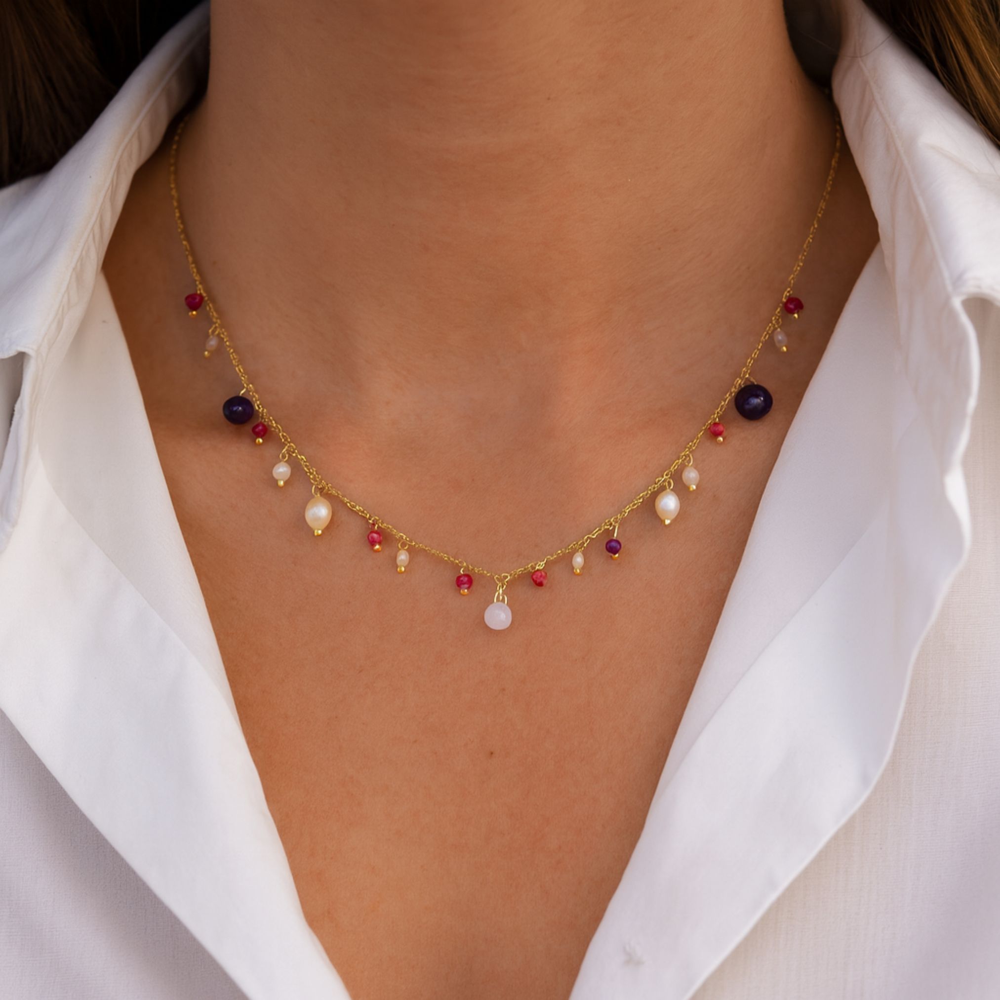 Zwischen den Edelsteinen finden sich zarte, kleine Süßwasserperlen wieder, die dem Collier eine sanfte, verspielte Note verleihen