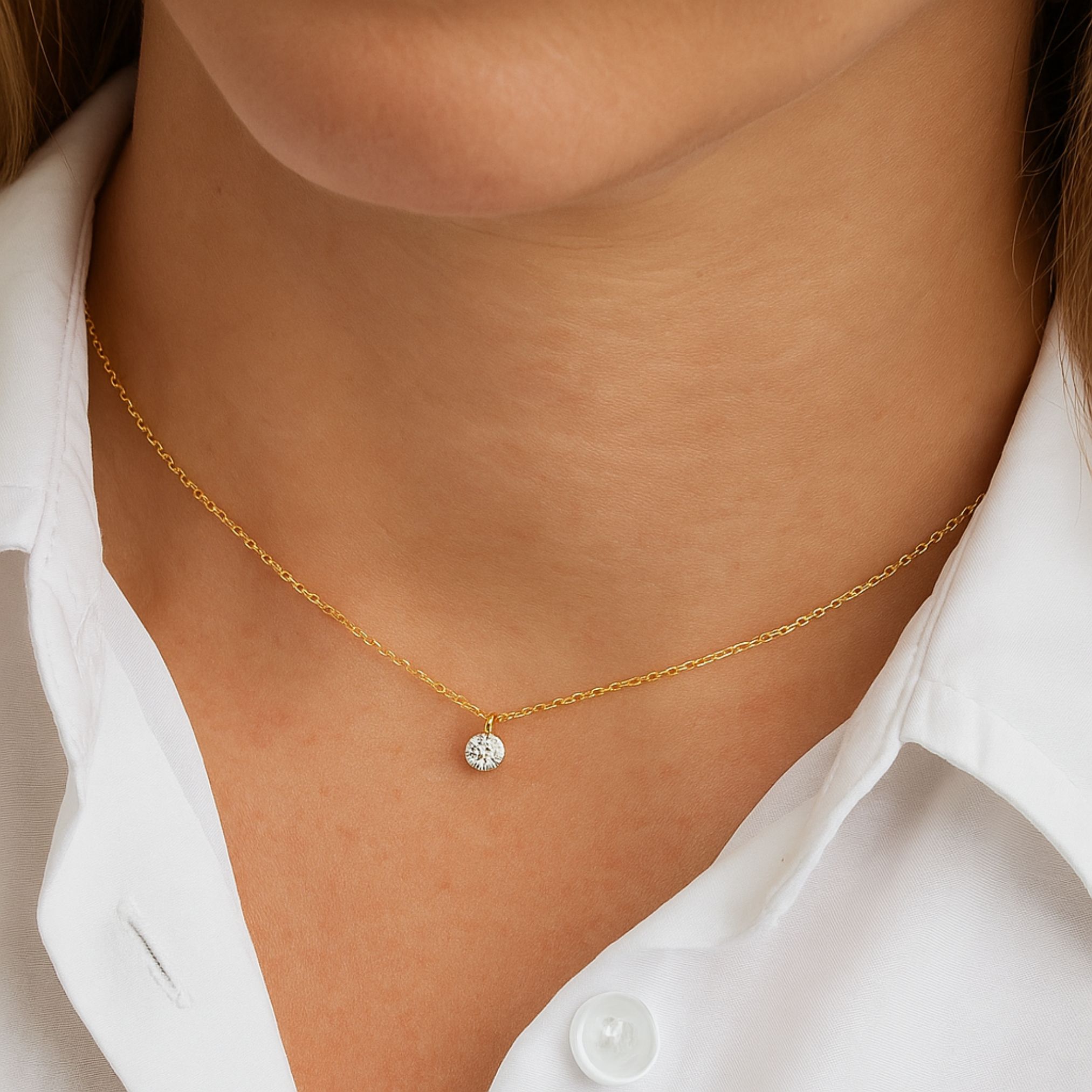 Die zarte Gelbgoldkette mit einer Länge von 42–45 cm rundet das minimalistische Design harmonisch ab.