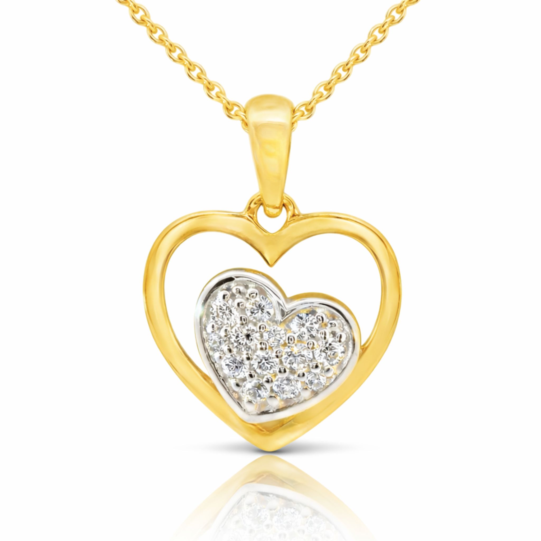 Im Inneren des offenen Goldherzens liegt ein zweites Herz, das mit 13 funkelnden Zirkonia-Steinen verziert ist.