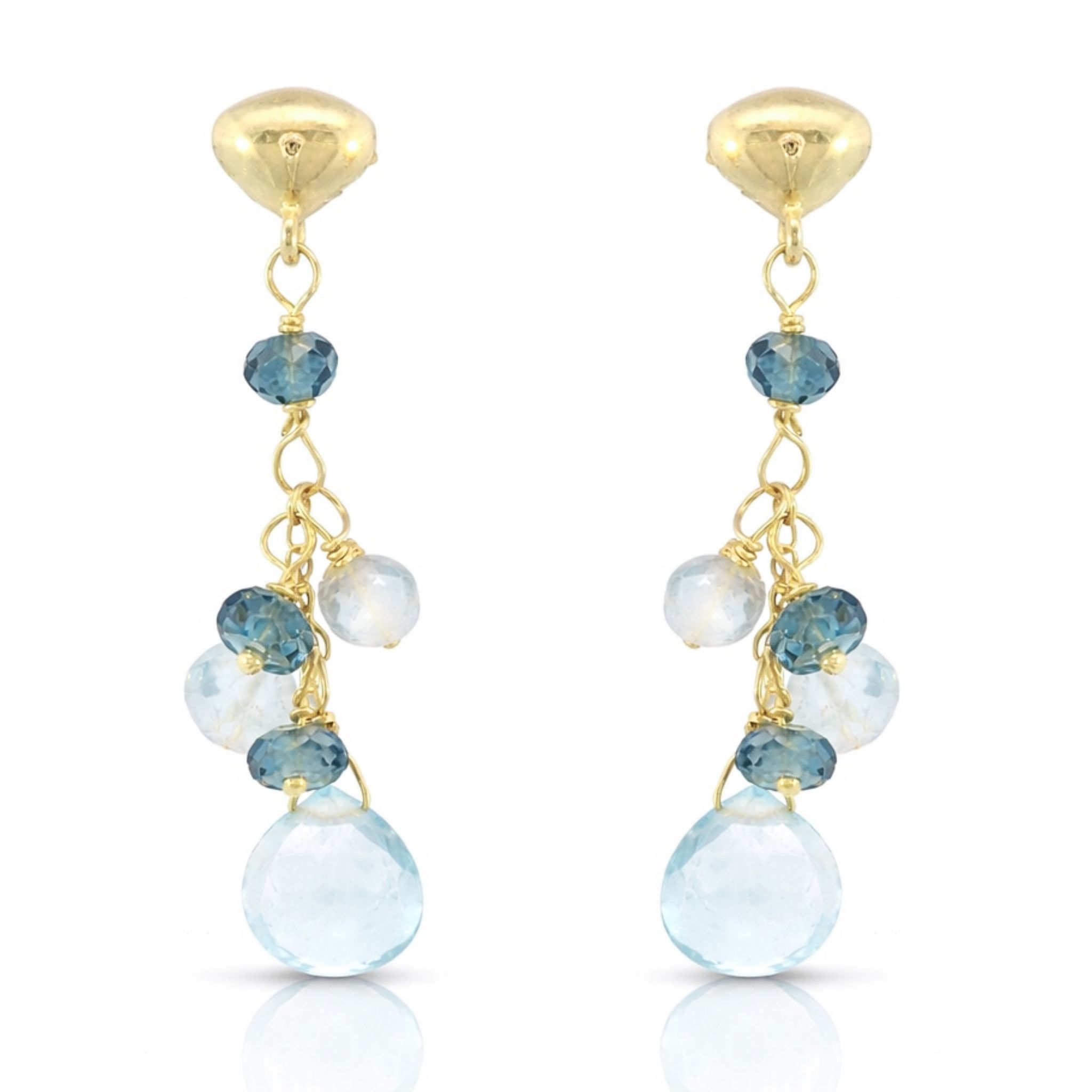 Jeder Ohrhänger ist mit sechs fein facettierten Topasen geschmückt. Die harmonisch abgestimmten Blau- und Hellnuancen verleihen dem Schmuckstück eine lebendige Tiefe und lassen die Steine bei jeder Bewegung sanft funkeln. Die locker angeordneten Edelsteine schwingen leicht mit und sorgen für eine feminine, verspielte Ausstrahlung.