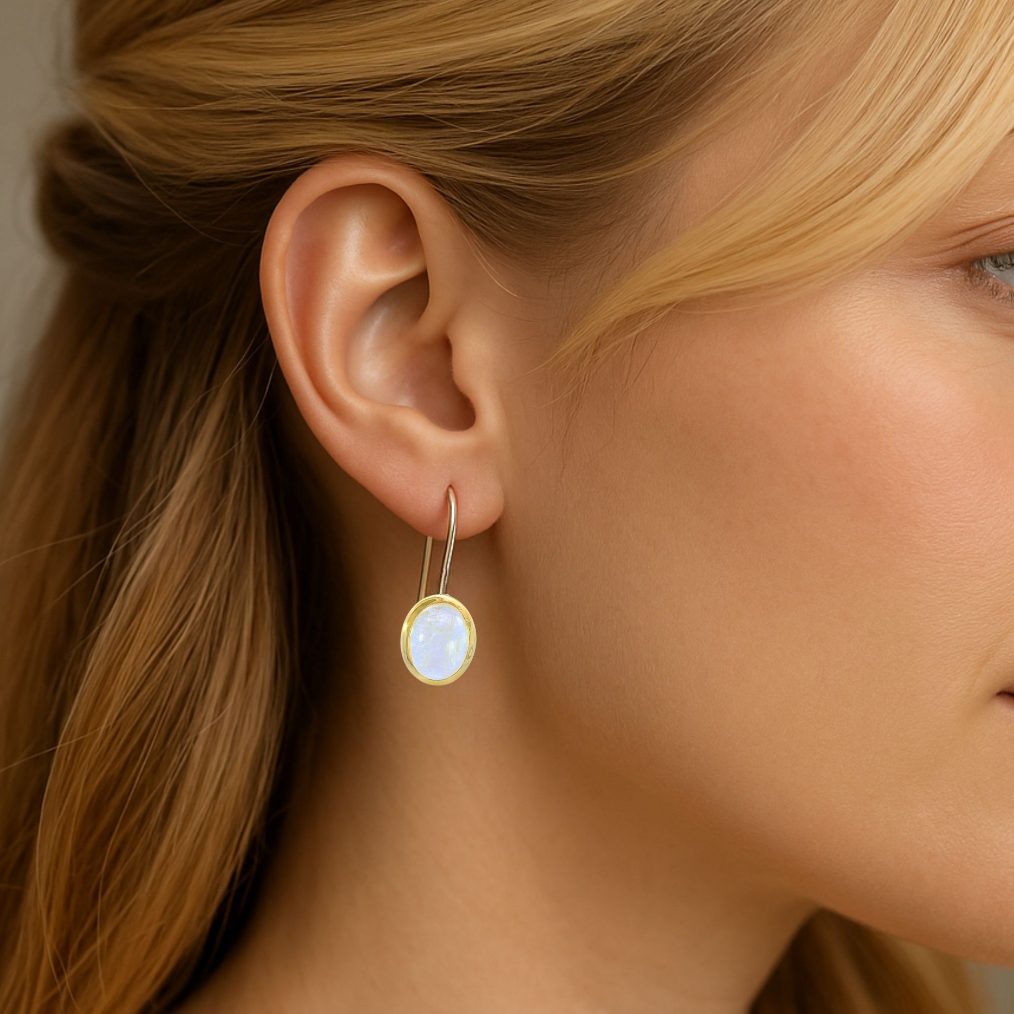Jeder Ohrhänger trägt einen echten Mondstein, dessen schimmerndes Farbspiel – auch Adulareszenz genannt – wie ein sanfter Mondschein über der Oberfläche tanzt.