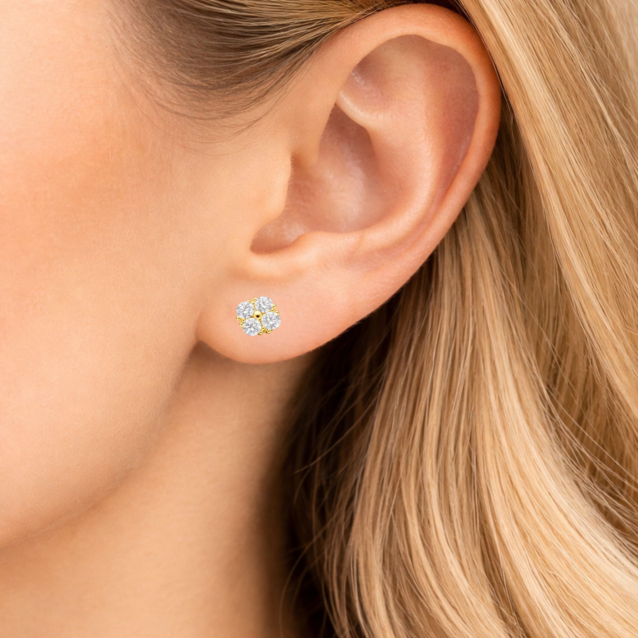Jeder Ohrstecker ist mit vier strahlenden Zirkonia besetzt, die das Licht lebendig reflektieren und für ein harmonisches, edles Funkeln sorgen. Die hochglanzpolierte Oberfläche des Gelbgolds unterstreicht die Brillanz der Steine und verleiht dem Schmuckstück eine warme, luxuriöse Ausstrahlung.