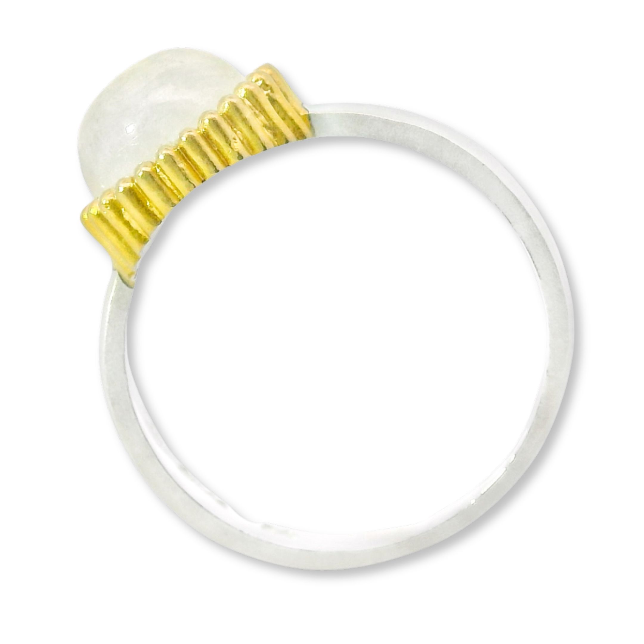 Der Mittelpunkt des Designs ist ein faszinierender Mondstein, dessen zarter Schimmer in sanftem Licht geheimnisvoll spielt.