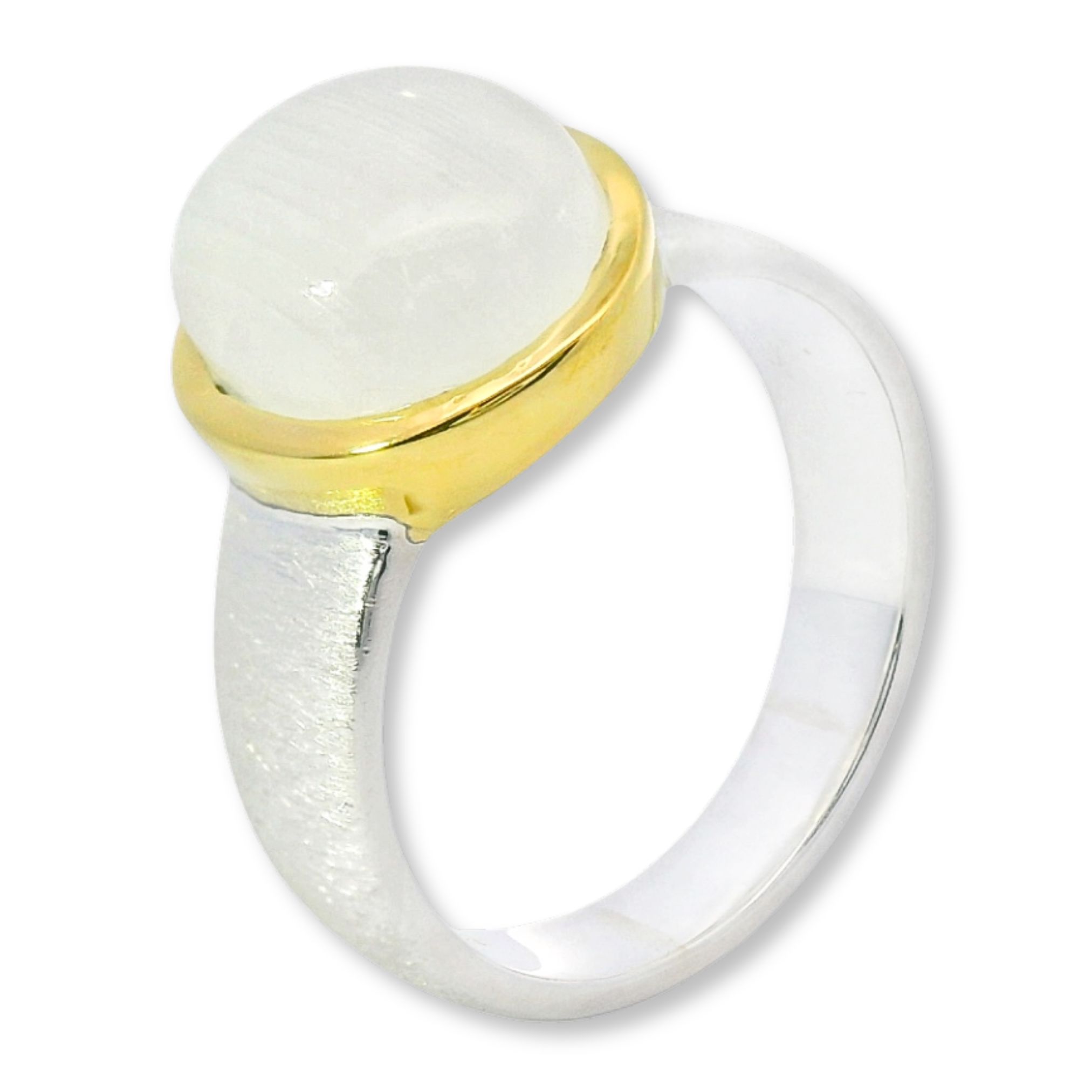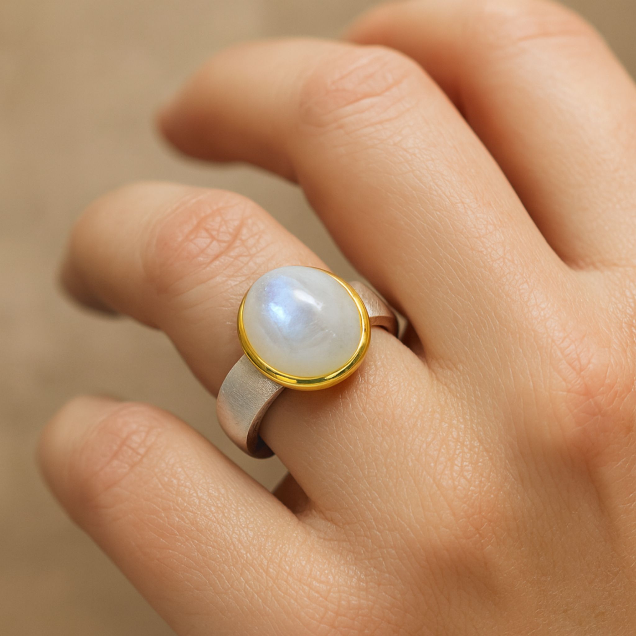 Der zarte Schimmer des Mondsteins erinnert an das Licht des Mondes auf stiller Wasseroberfläche und verleiht dem Ring eine beinahe mystische Ausstrahlung.