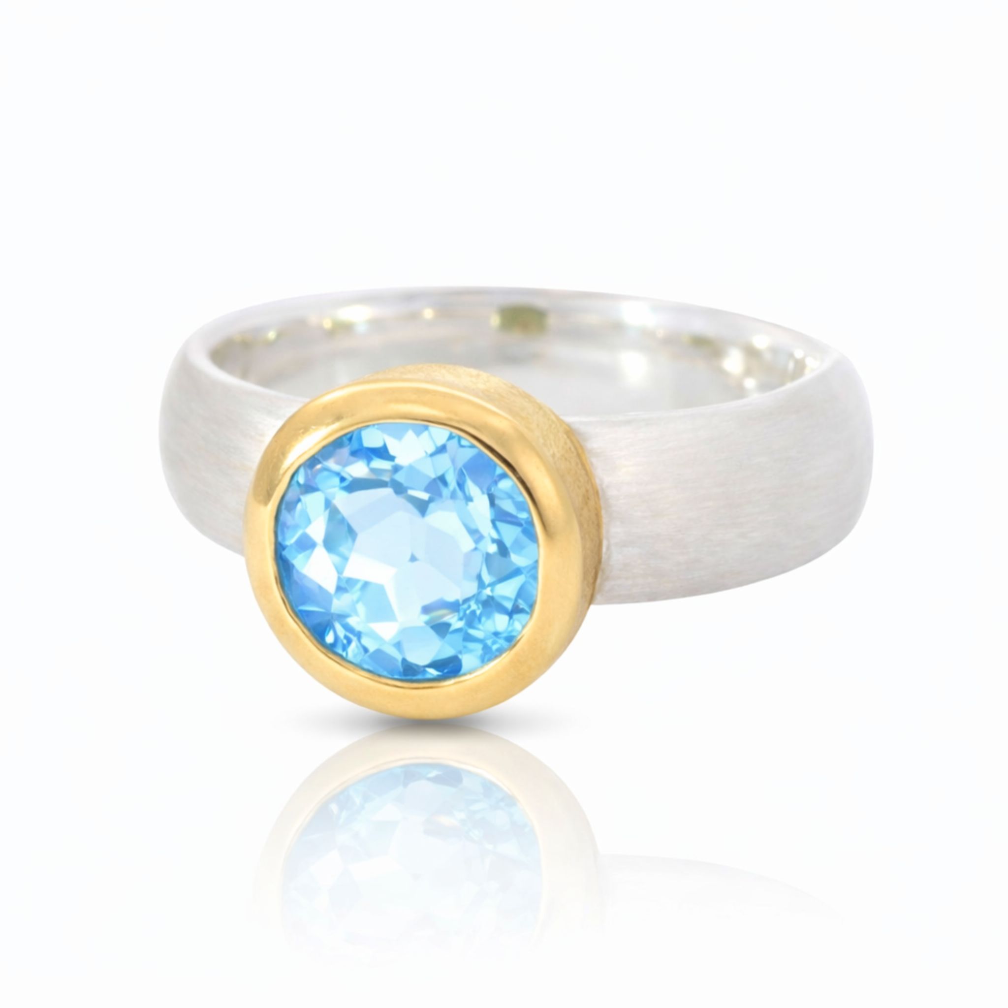 Ring aus 925 Silber mit vergoldeter Fassung und hellblauen Topas