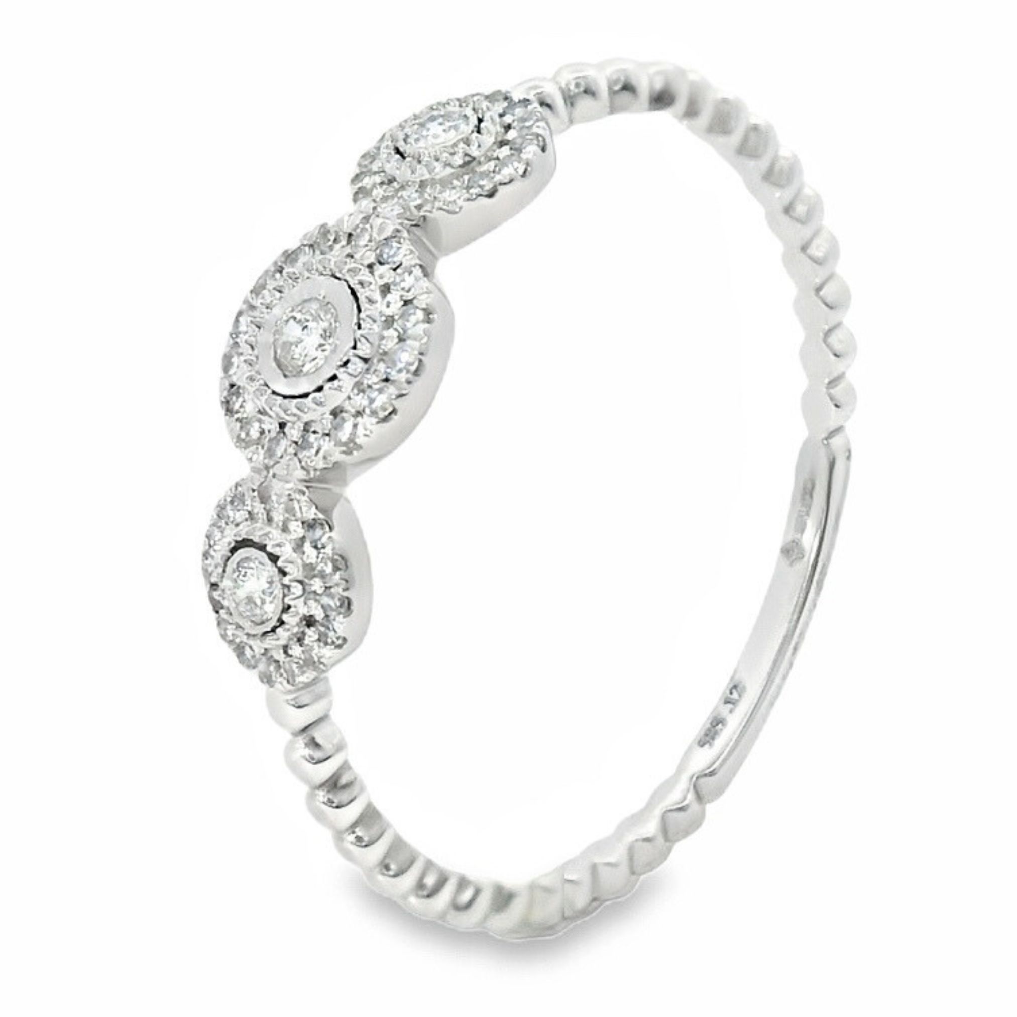 Ein Hauch von Luxus und feminine Eleganz vereinen sich in diesem wunderschönen Ring aus 585 Weißgold. Drei feine Diamanten im Brillantschliff, umrahmt von funkelnden Pavé-Diamanten, verleihen dem Ring ein außergewöhnliches Strahlen. Mit einem Gesamtgewicht von 0,12ct in W/Si-Qualität ist dieses Schmuckstück ein Symbol für zeitlose Schönheit und stilvolle Zurückhaltung.