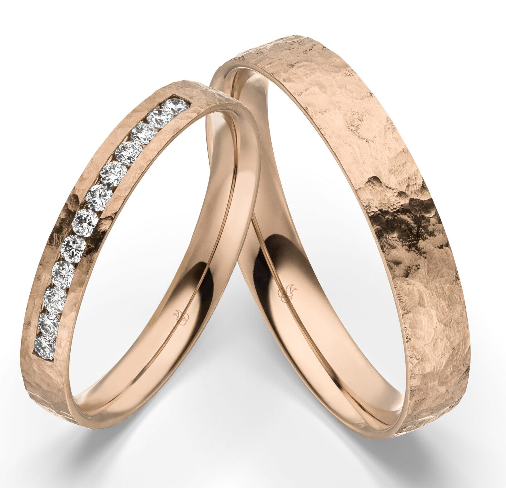 Diese edlen Trauringe aus Rotgold vereinen klassische Eleganz mit modernem Design. Die Oberfläche im Schiefer-Look verleiht den Ringen eine einzigartige Struktur und sorgt für eine unverwechselbare Ausstrahlung. Der Damenring ist 3mm breit und mit 12 funkelnden Brillanten besetzt, die für ein zeitloses Funkeln und luxuriösen Glanz stehen. Der Herrenring überzeugt mit einer 4mm Breite und einer schlichten, maskulinen Eleganz. Das warme Rotgold harmoniert perfekt mit der markanten Schiefer-Oberfläche und macht diese Eheringe zu etwas ganz Besonderem. Sie vereinen die Symbolik klassischer Trauringe mit einer modernen Interpretation, die Individualität und Stilbewusstsein zum Ausdruck bringt.