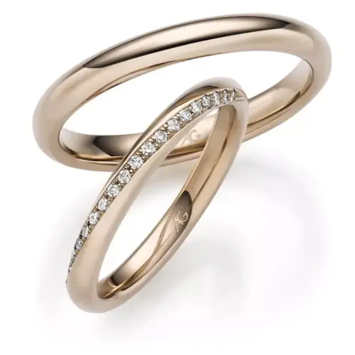 Diese außergewöhnlichen Trauringe aus Roségold vereinen zeitlose Eleganz mit einer modernen, romantischen Ausstrahlung. Der Damenring ist kunstvoll verschlungen – zwei zarte Linien, die sich wie Liebende für immer miteinander verbinden. Funkelnde Brillanten begleiten diesen Weg und lassen die Liebe in jedem Augenblick strahlen. Der Herrenring besticht durch seine klare, polierte Form. Schlicht und stark, verkörpert er Beständigkeit und Treue – ein Ring, der jeden Tag an das schönste Versprechen erinnert. Gemeinsam stehen diese Ringe für die Harmonie zweier Menschen, die ihr Leben miteinander teilen. Das warme Schimmern des Roségolds verleiht ihnen eine unvergleichliche Wärme und Tiefe – ein Sinnbild für die Zuneigung und Geborgenheit, die zwei Herzen vereint.