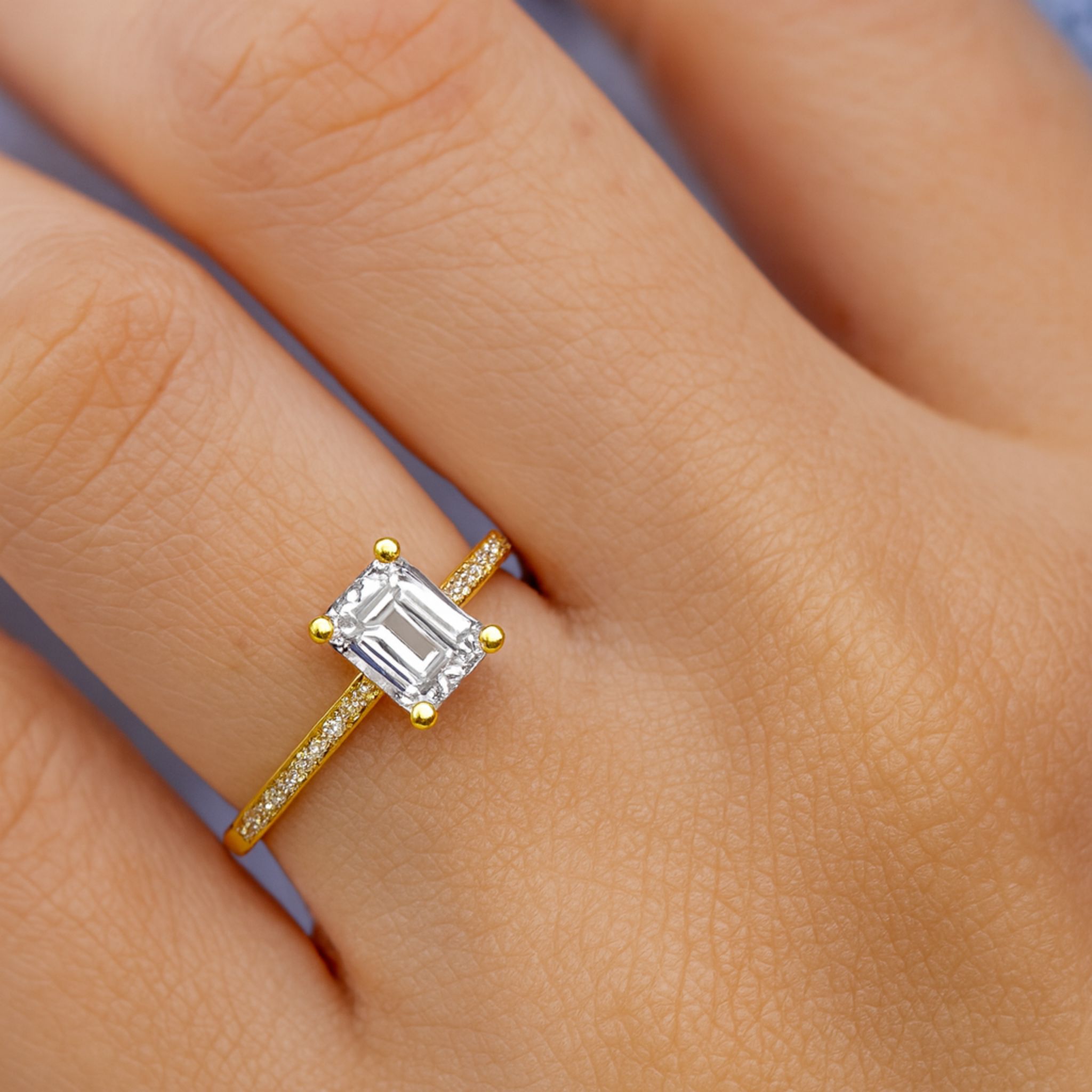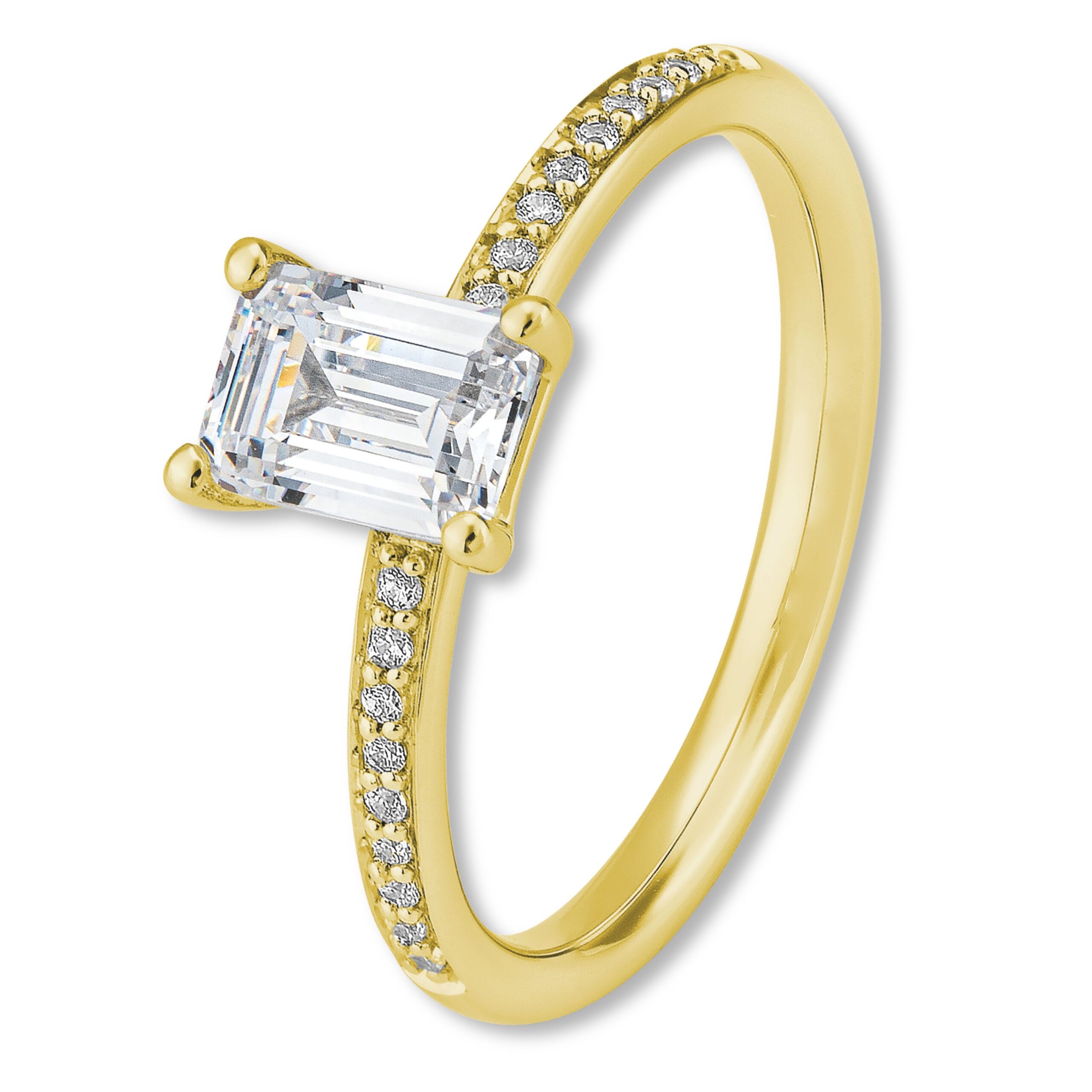 Im Mittelpunkt thront ein eleganter Mittelstein im Emeraldschliff, der durch seine klare, rechteckige Form pure Raffinesse und Stil verkörpert. Um diesen besonderen Stein sind 18 funkelnde Diamanten im Brillantschliff in die Ringschiene angeordnet, zusammen ergeben die verarbeiteten Diamanten in diesem Verlobungsring 1,099 Karat, die puren Glanz und Leidenschaft vereinen. Die Diamanten in H/Si-Qualität sorgen für ein harmonisches Zusammenspiel aus Helligkeit und Klarheit, das den Ring zum Strahlen bringt.