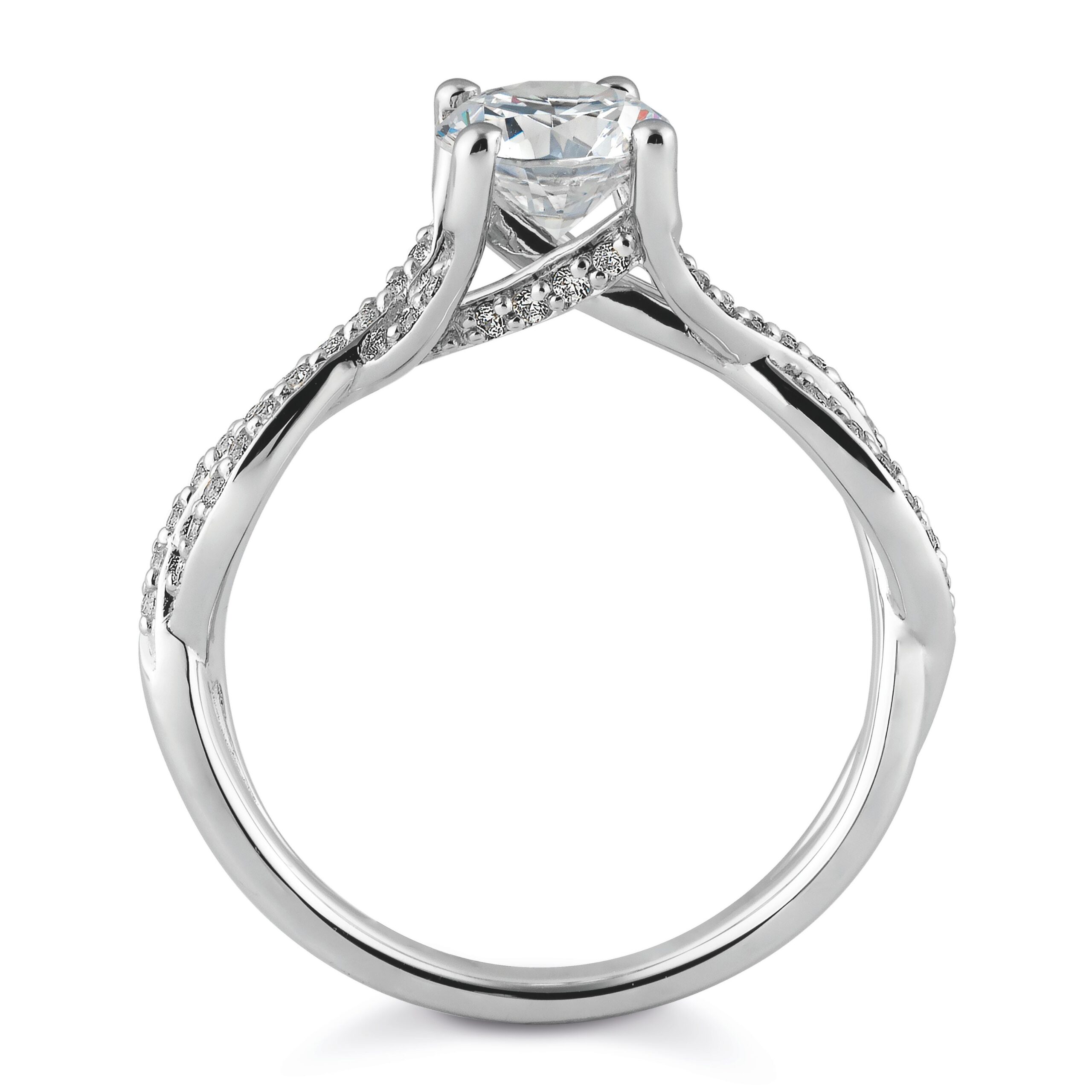 Im Mittelpunkt steht ein beeindruckender, großer Brillant, der durch die kunstvolle Verschlingung der Ringschiene perfekt hervorgehoben wird.