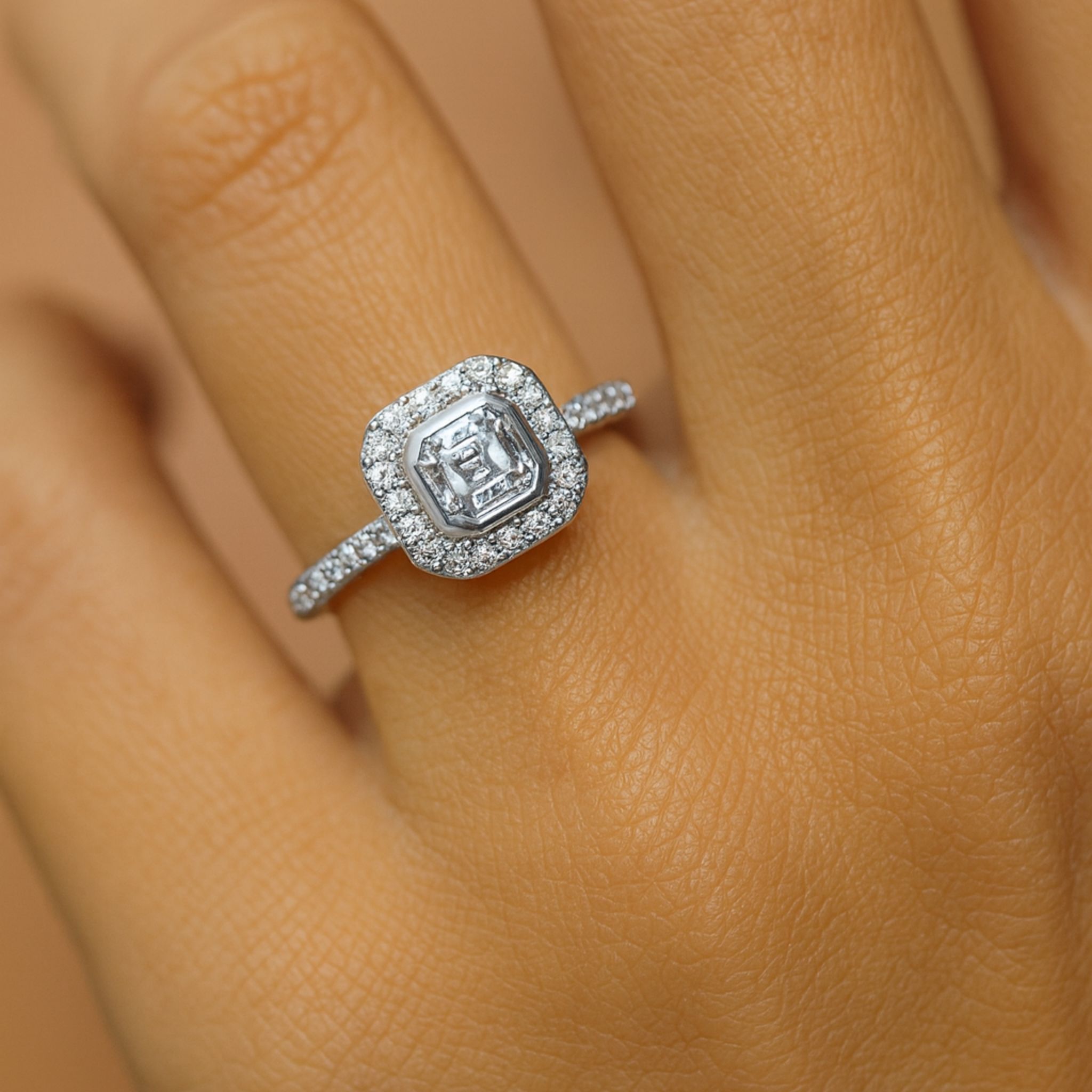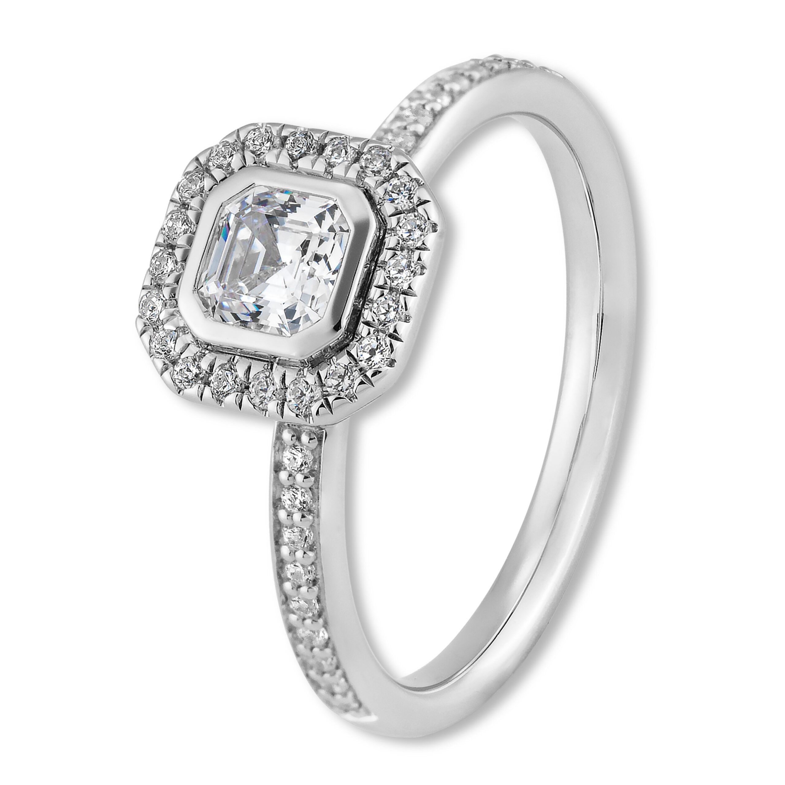 Im Zentrum des Rings thront ein beeindruckender Diamant in der eleganten Schliffform Asscher. Sein klarer, quadratischer Schliff mit den charakteristischen,