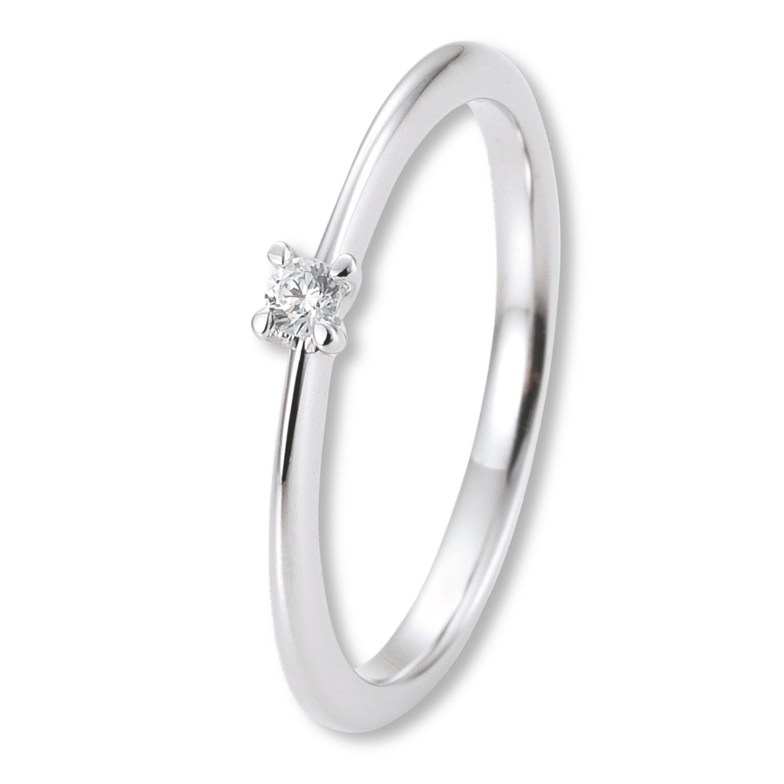 Im Mittelpunkt strahlt ein kleiner, aber bedeutungsvoller Diamant mit 0,05 Karat im klassischen Brillantschliff. Dieser funkelnde Stein ist in einer filigranen 4er Krappenfassung gehalten, die den Diamanten sicher umschließt und seine Schönheit perfekt zur Geltung bringt. Die schmale, verlaufende Ringschiene wird zum Brillanten hin immer schmaler, was den Eindruck von Leichtigkeit und Raffinesse verstärkt – ein dezentes, aber kraftvolles Versprechen.