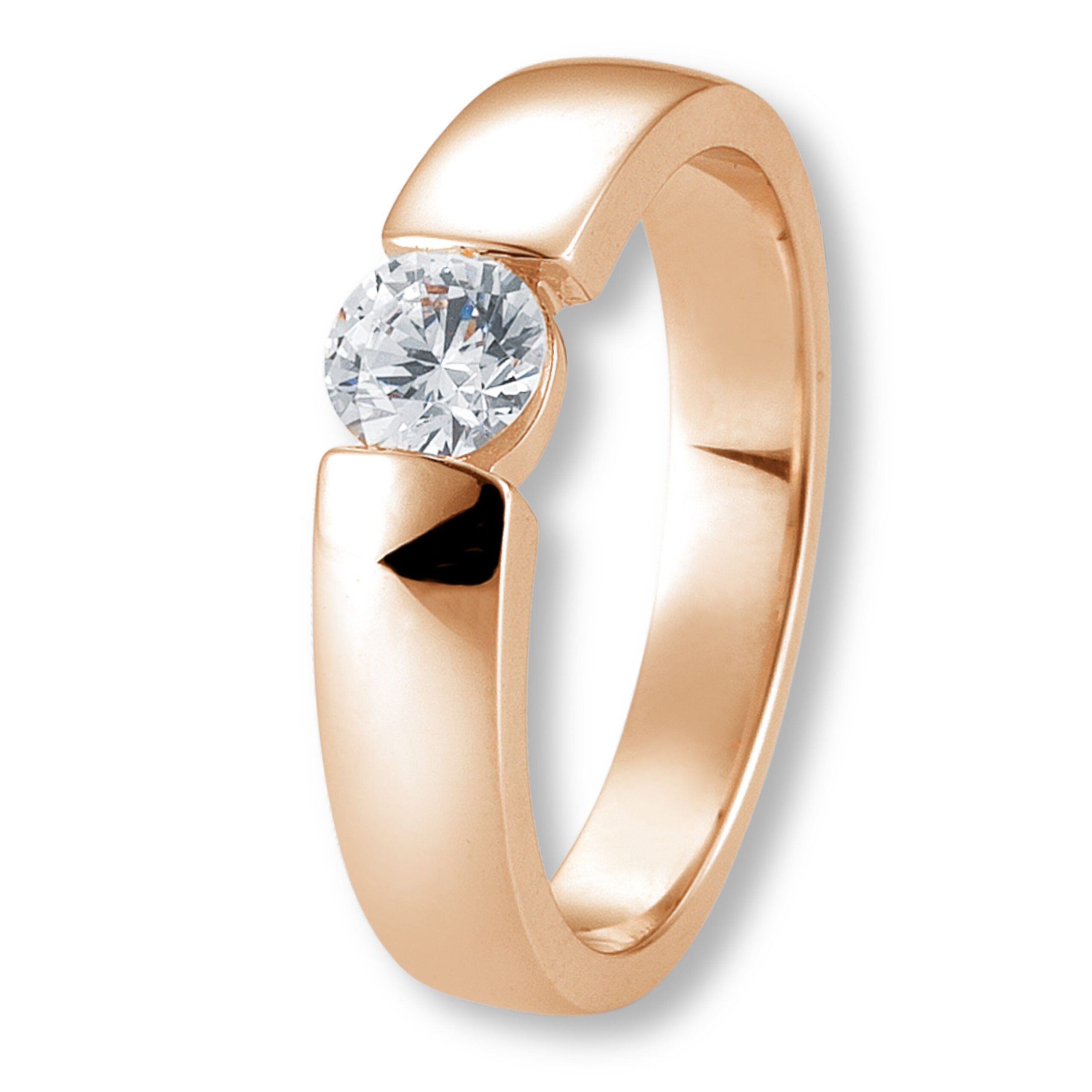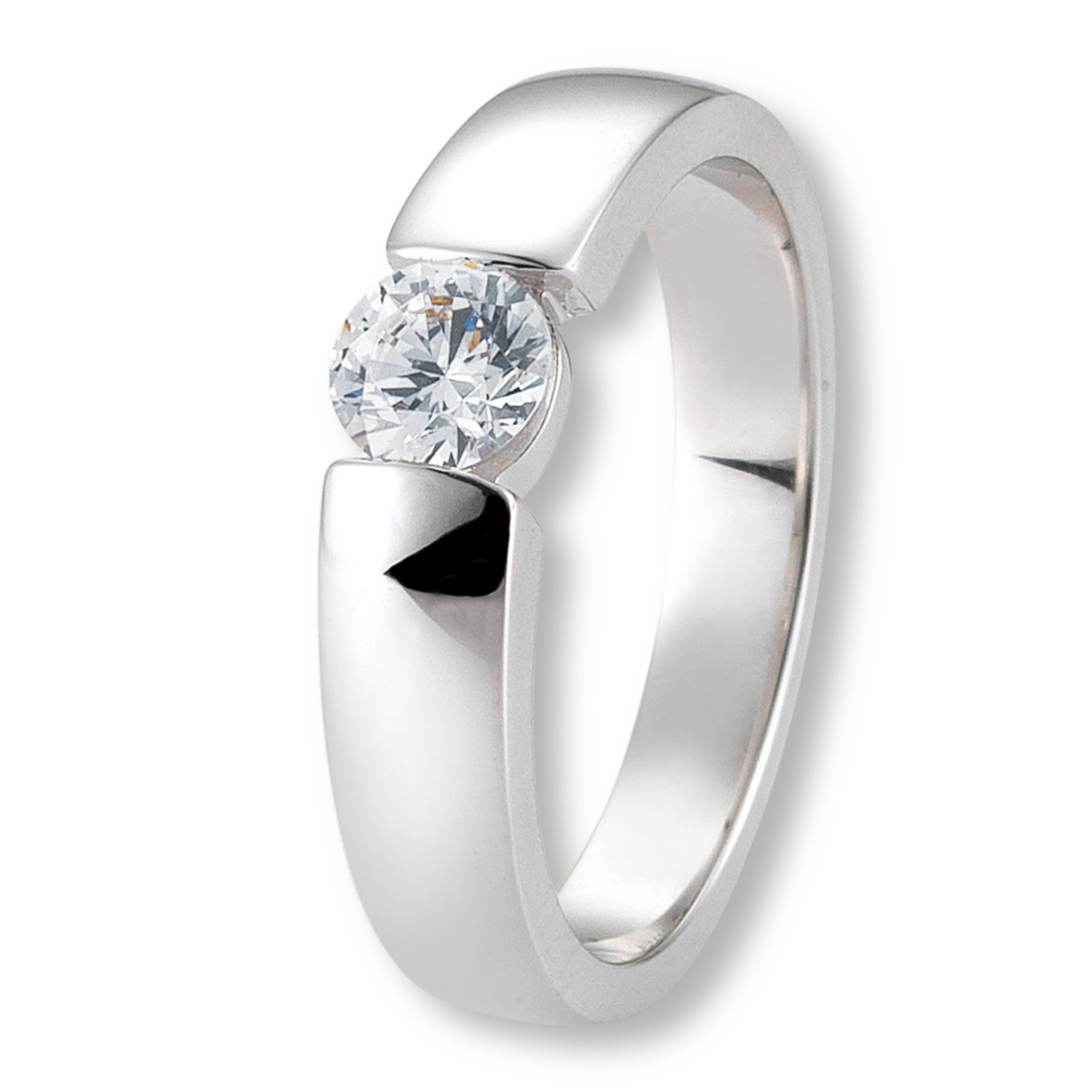 Der Verlobungsring ist in einer eleganten Spannringoptik gestaltet, bei der der Diamant scheinbar in der Luft schwebt und durch die präzise Fassung sicher gehalten wird.