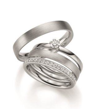 Set ab € 3456,-Legierungen: 333/375/585/750/ Pd500/Pd950/ Pt600/Pt950 Ringbreite: DR 3,0 mm HR 4,0 mm ab € 1041,- nur Trauringe ohne Beisteckring & Verlobungsring ab € 1420,- Beisteckring ab € 995,- Verlobungsring Preise unterliegen… -